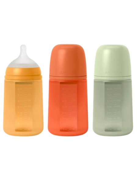 Biberón de silicona flexible de tacto suave y aterciopelado, una experiencia sensorial para tu bebé. Además, el exterior de este biberón ha sido sometido a un tratamiento sin aditivos que minimiza la adhesión de pelusas y partículas de suciedad.