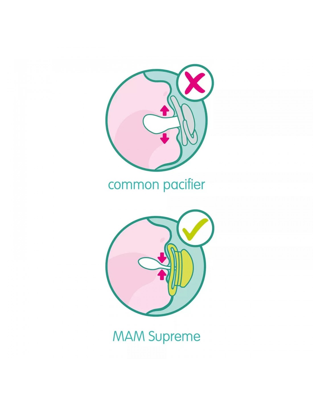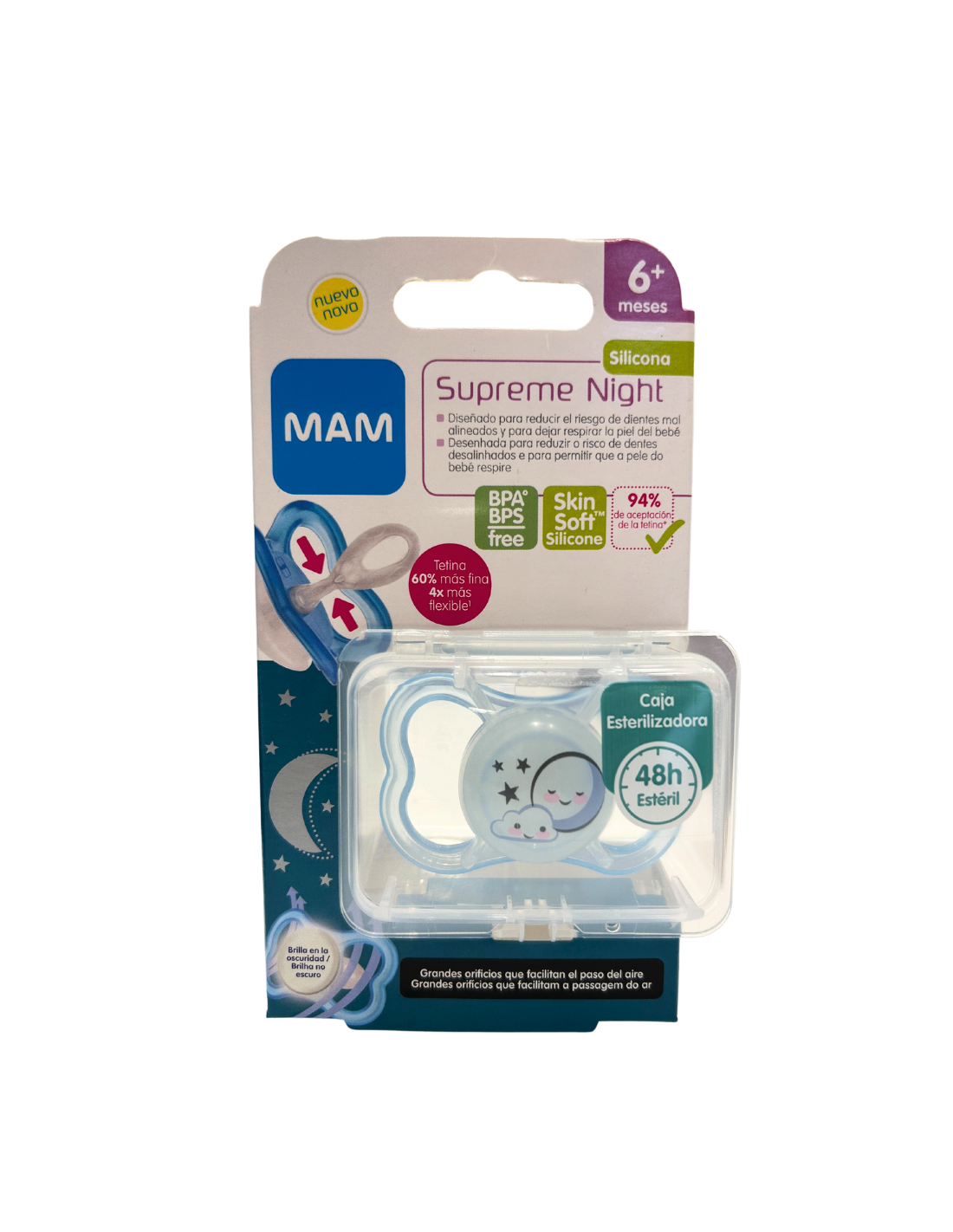El exclusivo chupete MAM Supreme Night ofrece el mejor apoyo para un desarrollo bucal saludable, además de ser especialmente cuidadoso con la piel. Es fácil de encontrar en la oscuridad gracias a su botón que brilla.