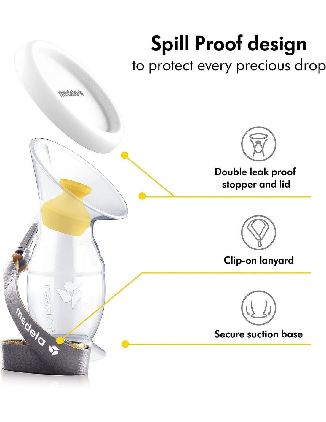 Con su diseño de doble sellado, cordón y base de sujeción, el colector evita el desperdicio de leche materna.