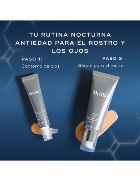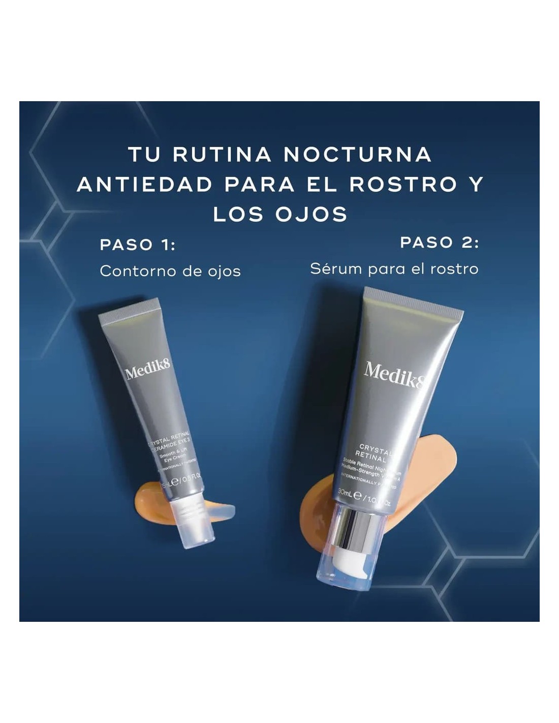 Crystal Retinal 3:Aplique 2 pulsaciones de Medik8 Crystal Retinal 3 sobre la piel limpia y seca por la noche en cara y cuello. Dejar absorber antes de aplicar una crema hidratante. Empezar a aplicarlo 2 veces por semana durante las dos primeras semanas, las dos semanas siguientes en días alternos y posteriormente, todas las noches. Se recomienda empezar por esta concentración de Crystal Retinal antes de subir a la siguiente potencia. Utilizar siempre protector solar durante el día.