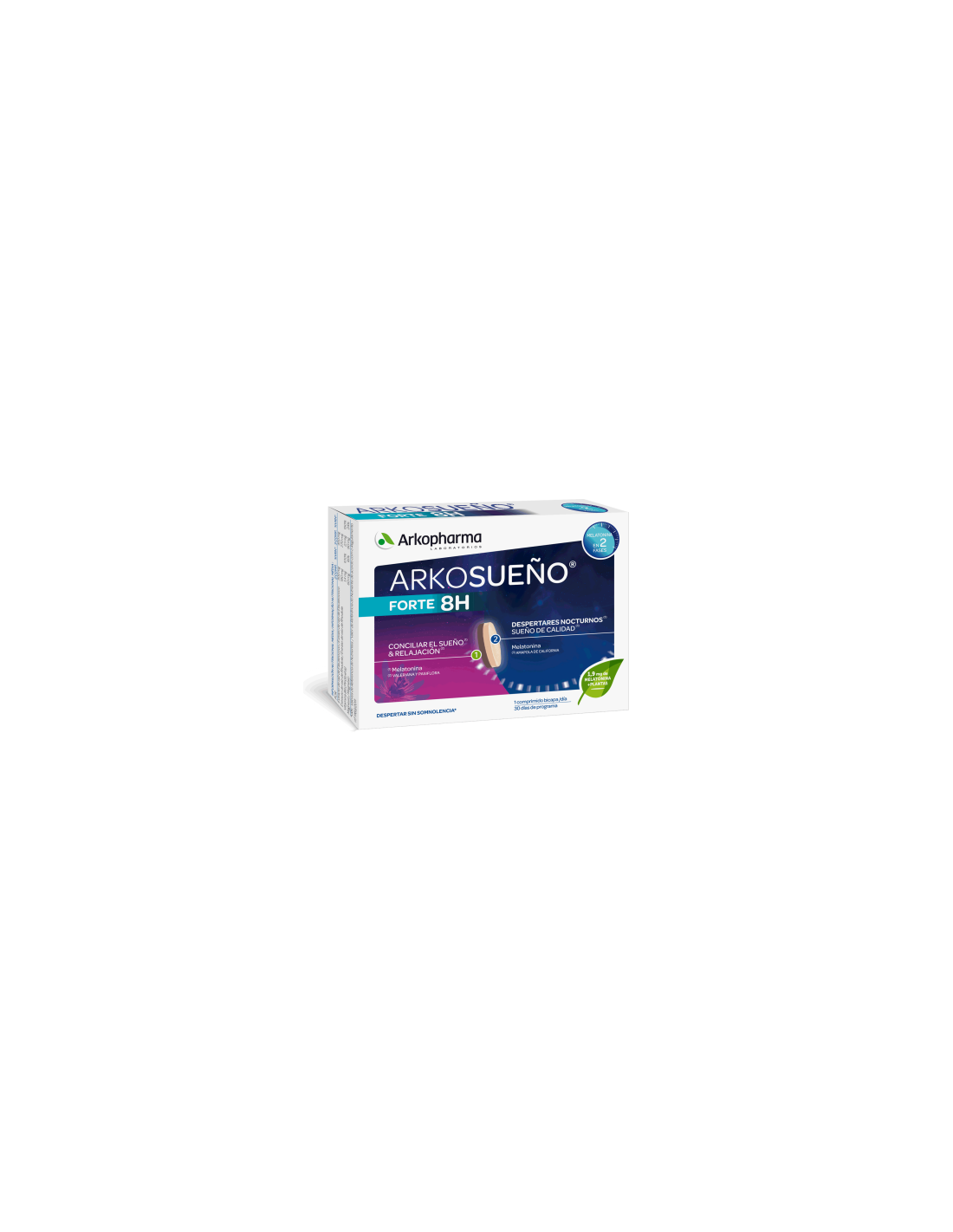 Arkosueño® Forte 8h garantiza una noche completa de sueño: los ingredientes de Arkosueño FORTE 8H se liberan a medida que son necesarios, también las plantas medicinales altamente concentradas: 1mg de melatonina + Pasiflora y Valeriana para conciliar el sueño y 0,9mg de melatonina + Amapola de California para reducir los despertares nocturnos.