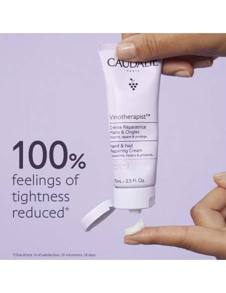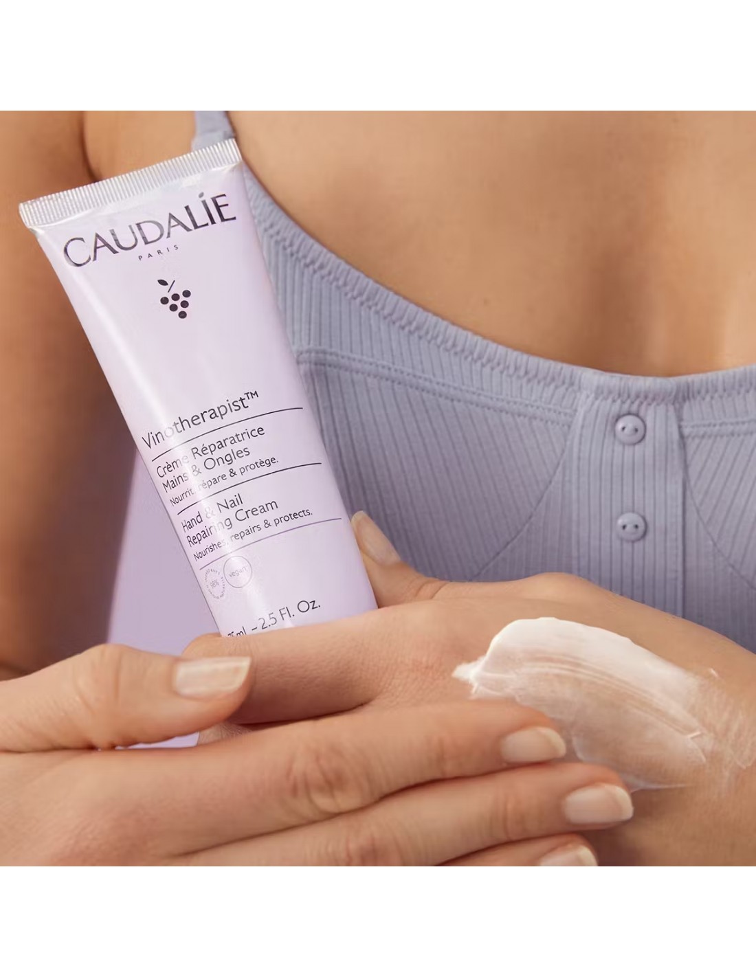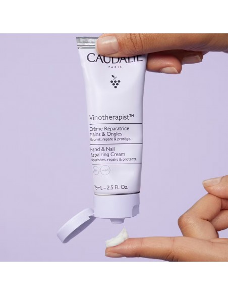 La Crema Reparadora para Manos y Uñas Vinotherapist nutre y repara las manos secas sin efecto graso, a la vez que las protege de la deshidratación y de las agresiones externas. Alivia la sensación de tirantez, suaviza la piel y fortalece las uñas y las cutículas.