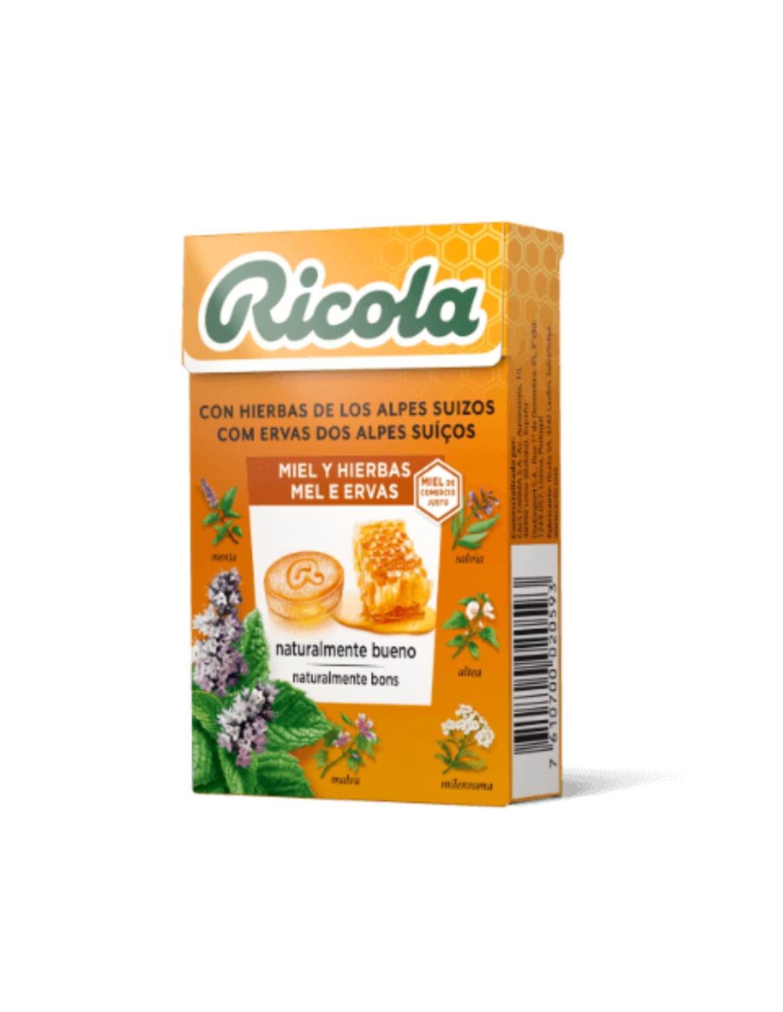 Azúcar, jarabe de glucosa, miel (5%), extracto (1,2%) de la mezcla de plantas aromáticas Ricola, aroma natural, colorante (caramelo natural), aceites esenciales de menta, mentol, agente de recubrimiento (goma arábiga). Cada caramelo (2,5 g) contiene 2,7 mg de mentol.