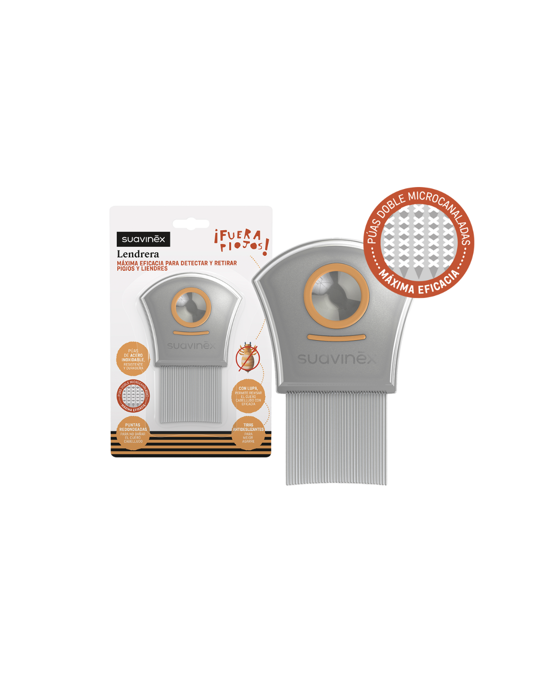 Elimina eficazmente piojos y liendres sin dañar el cabello. Púas finas, juntas y con punta redondeada.