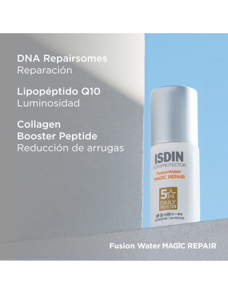 Protege tu piel del sol con Fusion Water MAGIC Repair SPF 50, el protector solar ultraligero de fase acuosa y uso diario. Hidrata la piel intensamente y proporciona triple acción antifotoenvejecimiento.