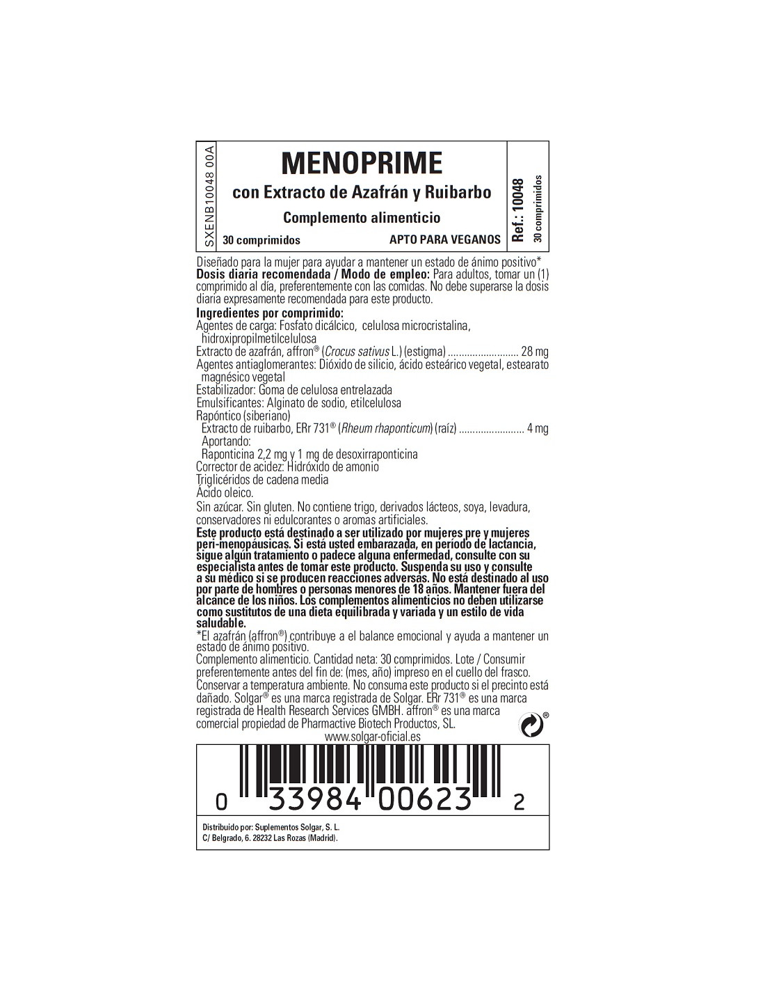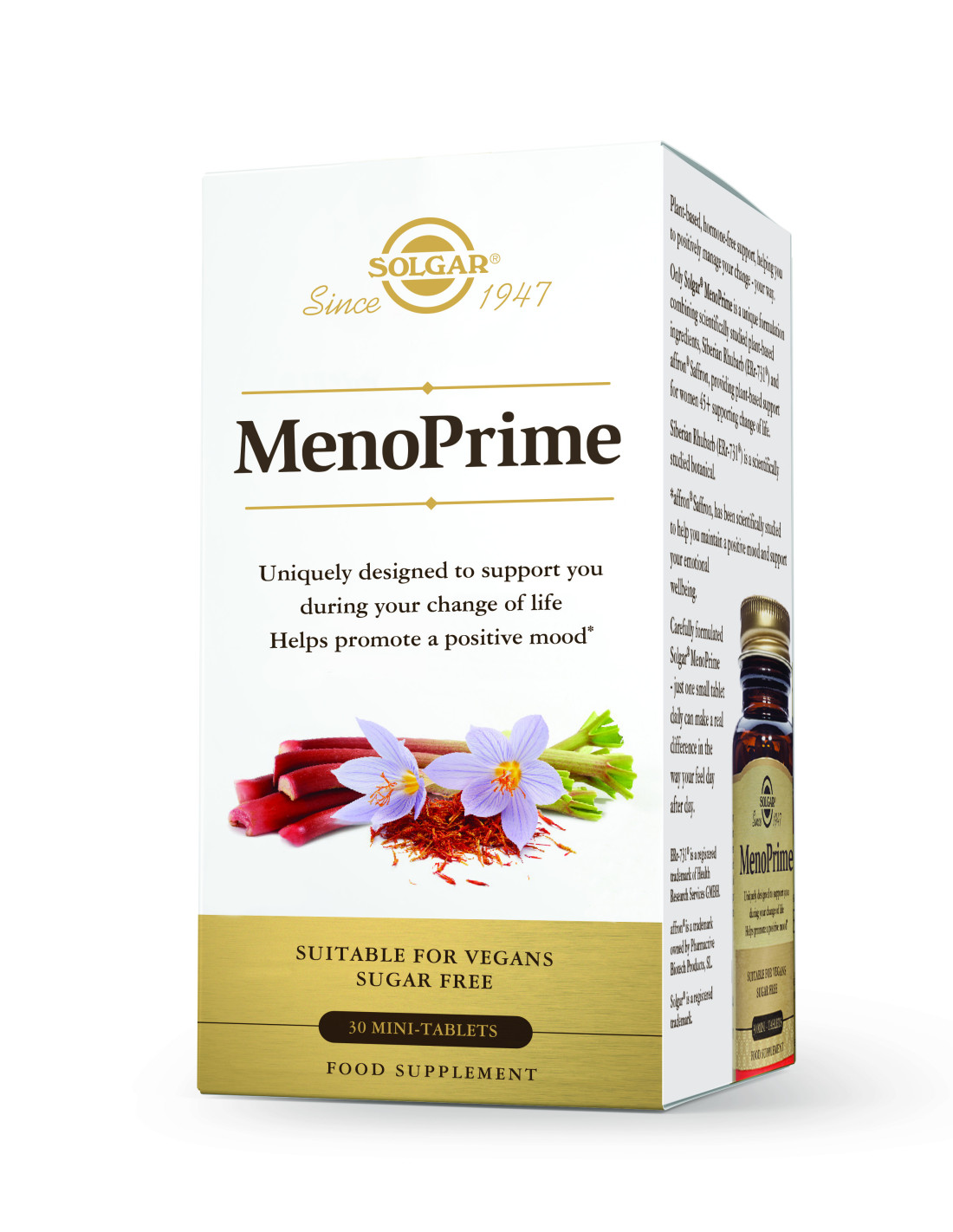 MenoPrime de Solgar es un producto innovador que ha sido diseñado para ayudar a las mujeres maduras durante la etapa de la menopausia y perimenopausia. Está formulado sin hormonas, y combina dos ingredientes botánicos patentados y clínicamente estudiados: azafrán (affron®) y ruibarbo siberiano (ERr-731®).