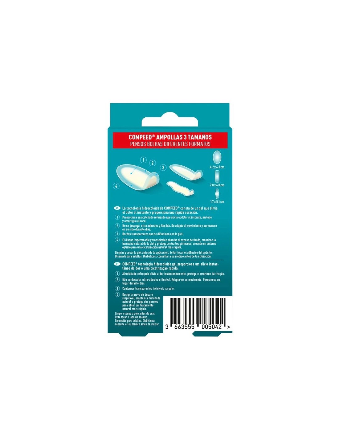 El pack incluye 4 apósitos ampollas medianas, 4 apósitos ampollas pequeñas y 2 apósitos dedos del pie.