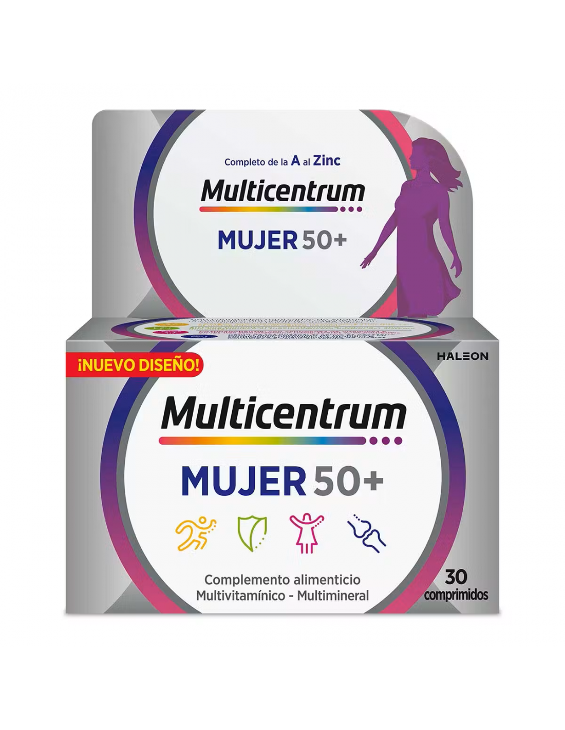 Suplemento multivitamínico especialmente formulado para mujeres mayores de 50 años. Su fórmula avanzada está diseñada para cubrir las necesidades nutricionales de las mujeres en esta etapa de la vida. Este producto contiene una combinación de vitaminas y minerales que contribuyen al funcionamiento normal del sistema inmunitario, a la función psicológica normal, al cuidado y mantenimiento de los huesos, la piel y mucosas, y favorece la energía y vitalidad diaria, mejorando la calidad de vida en esta fase de madurez.