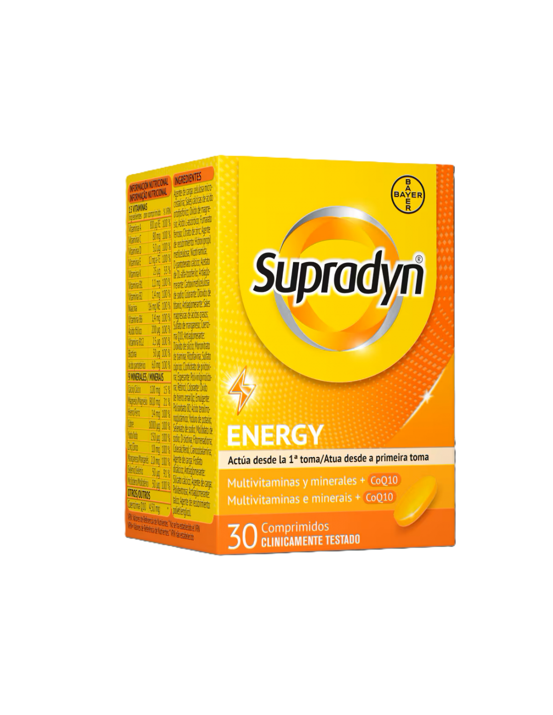 Cada comprimido de Supradyn Energy contiene una combinación de vitaminas y minerales esenciales. Estos ingredientes incluyen: vitamina A, vitamina C, vitamina E, vitamina D, vitamina B1, vitamina B2, vitamina B6, vitamina B12, vitamina K, ácido fólico, acido pantoténico, niacina, biotina, hierro, zinc, magnesio, calcio, cobre, yodo, Molibdeno, Manganeso y Selenio y Coenzima Q10. Estos nutrientes desempeñan un papel crucial en el metabolismo energético, la función cognitiva y la salud general del cuerpo.